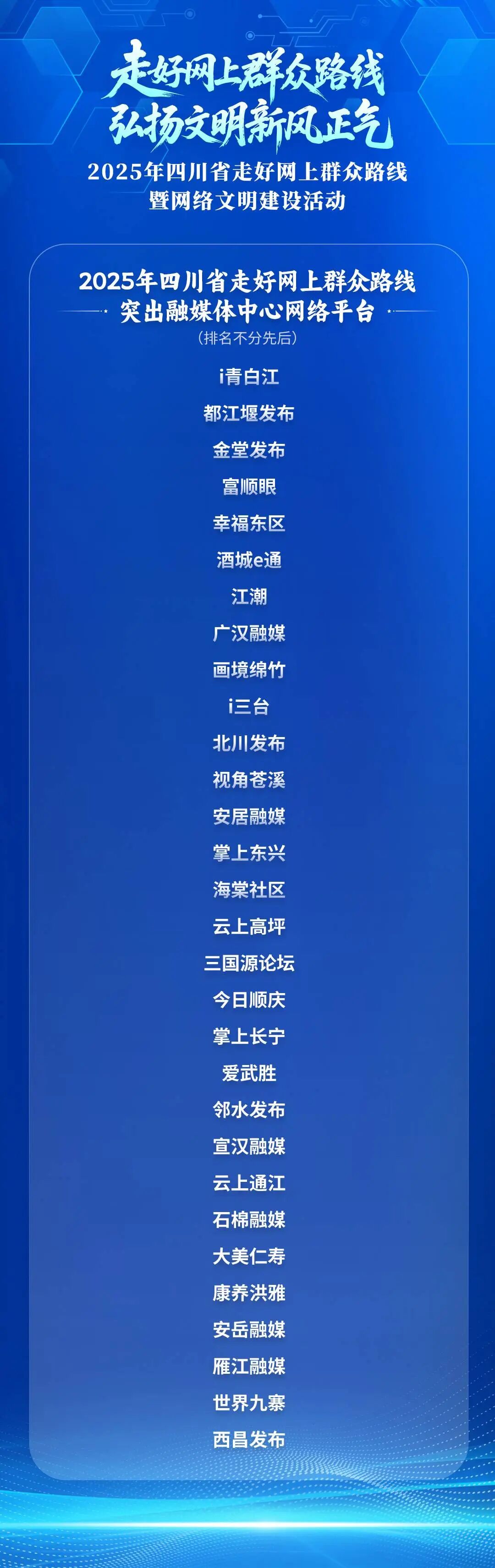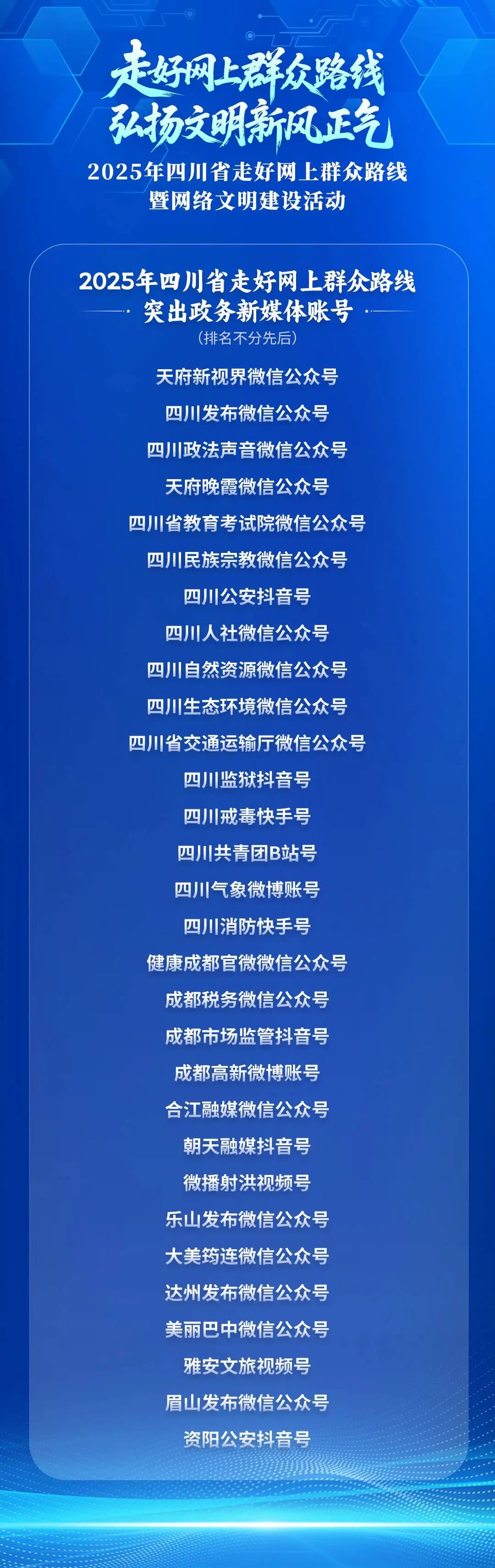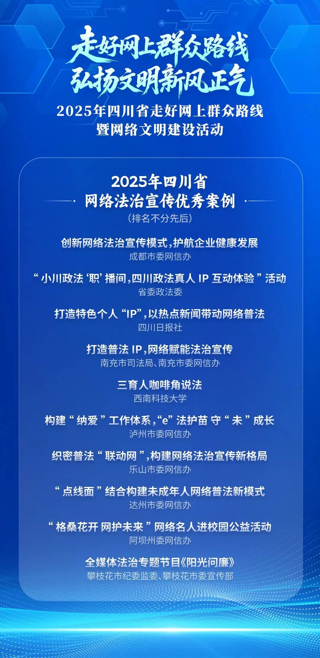 现场还为2025年走好网上群众路线突出政务新媒体账号、走好网上群众路线突出案例、走好网上群众路线突出融媒体中心网络平台、四川省网络法治宣传优秀案例、网络举报辟谣工作突出单位进行了颁奖,以典型引领激发各地各部门工作活力。