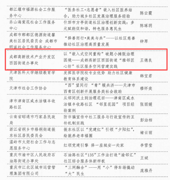 近日,中国社会工作联合会城乡社区工作委员会公布“2025城乡社区治理服务资料库”名单。成都高新区西园街道案例《以“嵌入式空间重构”破题小摊贩治理困境──成都高新区西园街道“雅邻匠心坊”社区服务空间营建实践》入选全国优秀经验案例。