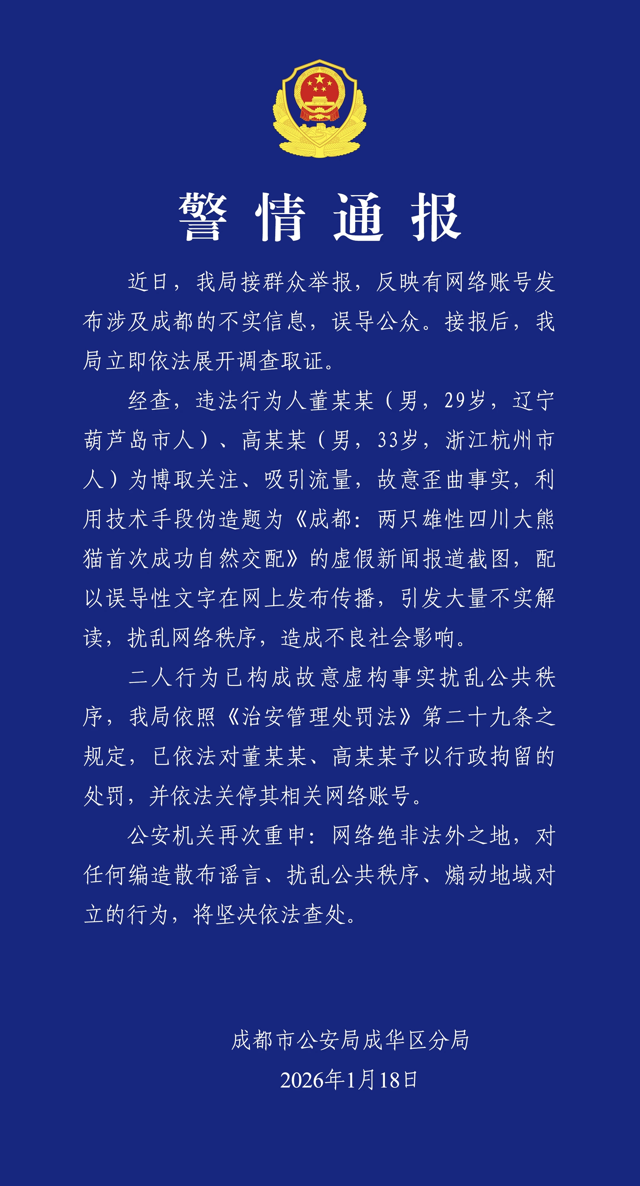 成都公安通报:为博流量,二人炮制熊猫虚假新闻被行政拘留