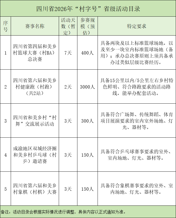 四川发布客户端消息 近日,四川省农业农村厅、四川省体育局联合发布《关于2026年“村字号”活动总体安排和遴选承办地的通知》,公布2026年“村字号”活动计划。根据通知,有意愿申办赛事活动的县(市、区),于2026年1月30日前,向农业农村厅、省体育局提出申办意向书。