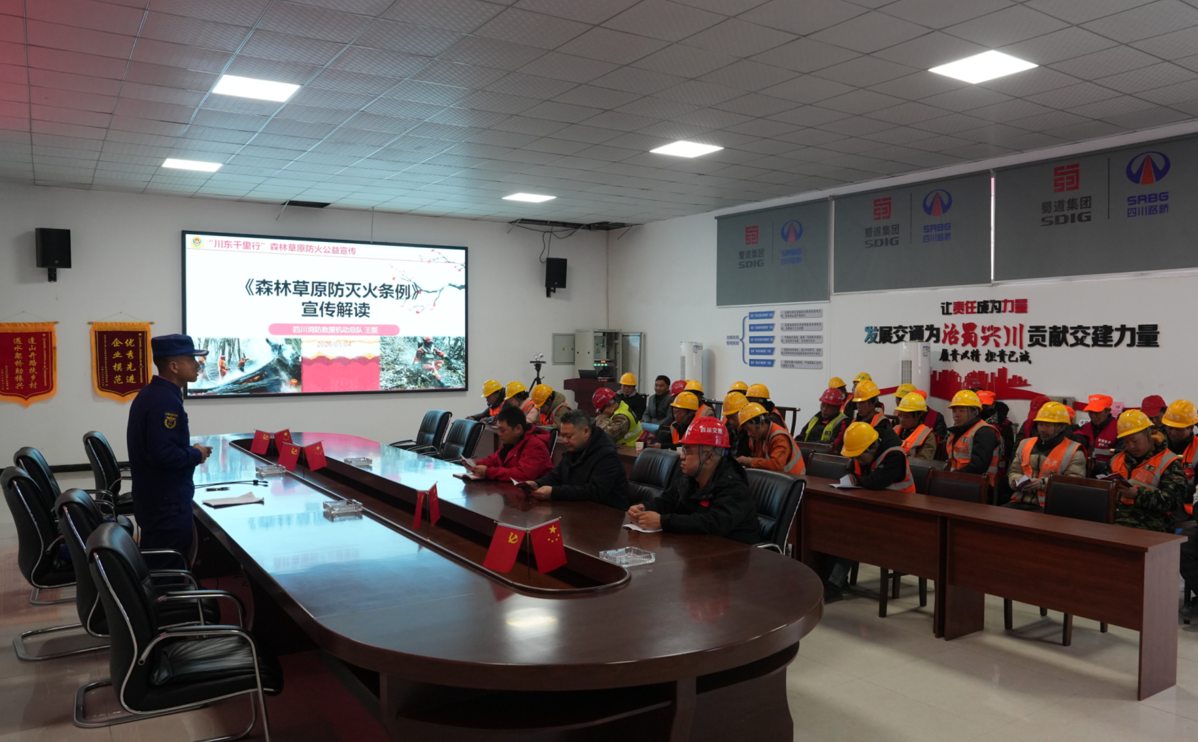 剑门关景区不远处,G5京昆广绵复线扩容工程5标段,工人们正赶着春节前这段时间抓紧施工。消防员的到来,让工地暂时安静下来。一堂特殊的“林间防火课”在工棚旁展开。“天干物燥,野外焊接、切割作业前要清除周边可燃物,备好灭火器、水枪灭火装备,以防火星溅落酿成大祸。”应急管理系统一级英模、队长助理侯正超的声音在寒风中格外清晰,他指着施工现场堆放的建材、临时用电线路和工棚取暖设备,结合近两年来省内施工引起火灾案例,指出一个个潜在风险,手把手演示灭火装备操作使用方法。