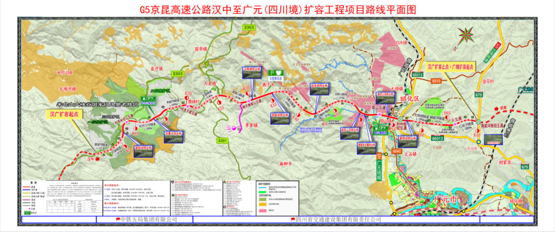 汉广扩容项目全长71.298公里,采用双向六车道高速公路标准建设,设计时速100公里,桥隧比84.3%,超过古金高速,是目前四川省内桥隧比最高的双向六车道山区高速公路。汉广扩容项目起自广元市旺苍县自生村(川陕交界处),连接待建的G5京昆高速公路扩容项目陕西段,经天星镇、燕子乡、荣山镇、龙潭乡,止于周家河乡附近,接G5兰海高速公路广元至南充段,对接在建的京昆高速公路广元至绵阳扩容项目。