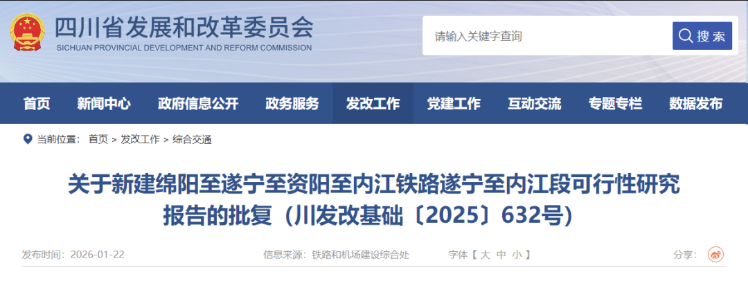 绵遂内铁路项目全线总长287.9公里,预计2030年全线建成通车,线路以绵阳站为起点,终至内江北站,贯穿绵阳、德阳、遂宁、资阳、内江五市共11个县级行政区,项目已列入国家《中长期铁路网规划》及成渝地区双城经济圈轨道交通专项规划。项目建成通车后,将结束三台县、射洪市不通铁路的历史,进一步完善川北、川南、川中区域城际铁路环线,对于促进沿线区域社会经济发展,加快推动成渝地区双城经济圈综合交通运输体系建设具有重大意义。其中,绵遂段已于2024年8月开工,计划2028年通车。