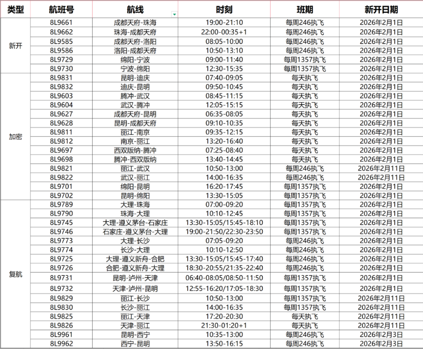 同时,对7条热门旅游航线进行运力升级,包括昆明至成都天府、昆明至迪庆、腾冲至武汉、丽江至南京等,航线每日执飞;昆明至绵阳航线将根据客流动态加密班次,每周一、三、五、七执飞,形成“节前返乡有保障、节后出游更从容”的弹性运力网络。复航航线精准匹配“返乡潮”与“旅游潮”双向需求,包括昆明经泸州至天津等特色线路,每周一、三、五、七执飞。