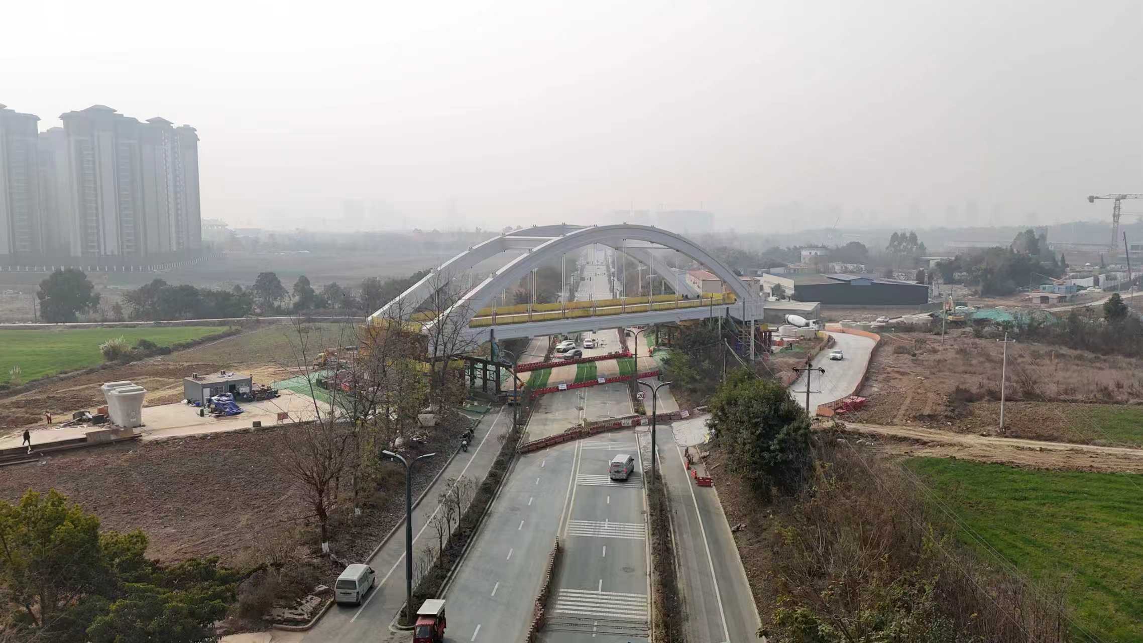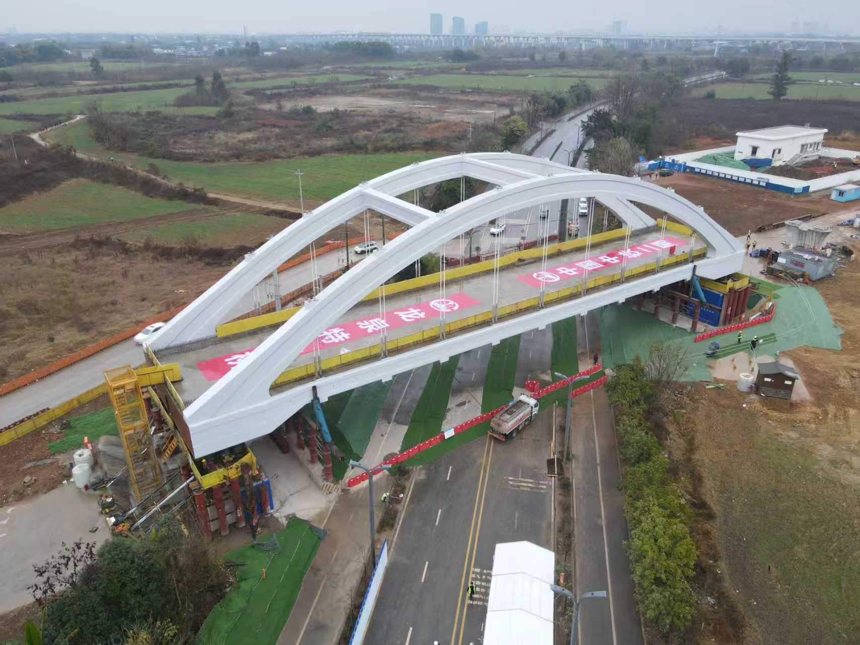 龙泉特大桥东起成都市龙泉驿区洛带镇,西至成华区龙潭街道,全长14公里,是成渝中线高铁全线最长的桥梁。在跨越成华区新龙石路时,需同时满足桥下道路通行净空和桥梁接入蜀安隧道的条件。受此影响,桥址处线路纵坡按25‰设计逐步下坡,坡度变化显著。该段无法采用高铁连续梁常用的普通箱梁或悬灌连续梁跨越,经综合比选,最终采用1孔72米系杆拱桥结构,配合高位落梁施工工艺,跨越既有市政道路。该桥型兼具适应大跨度、梁体高度低的特点,可最大限度保证桥下通行净空,从而在不中断桥下交通的情况下完成梁体施工。