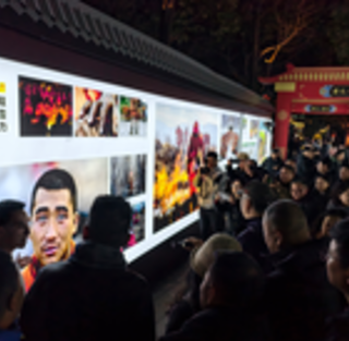 在成都锦里文化旅游街区,摄影展吸引市民和游客驻足欣赏。摄影:岳书华