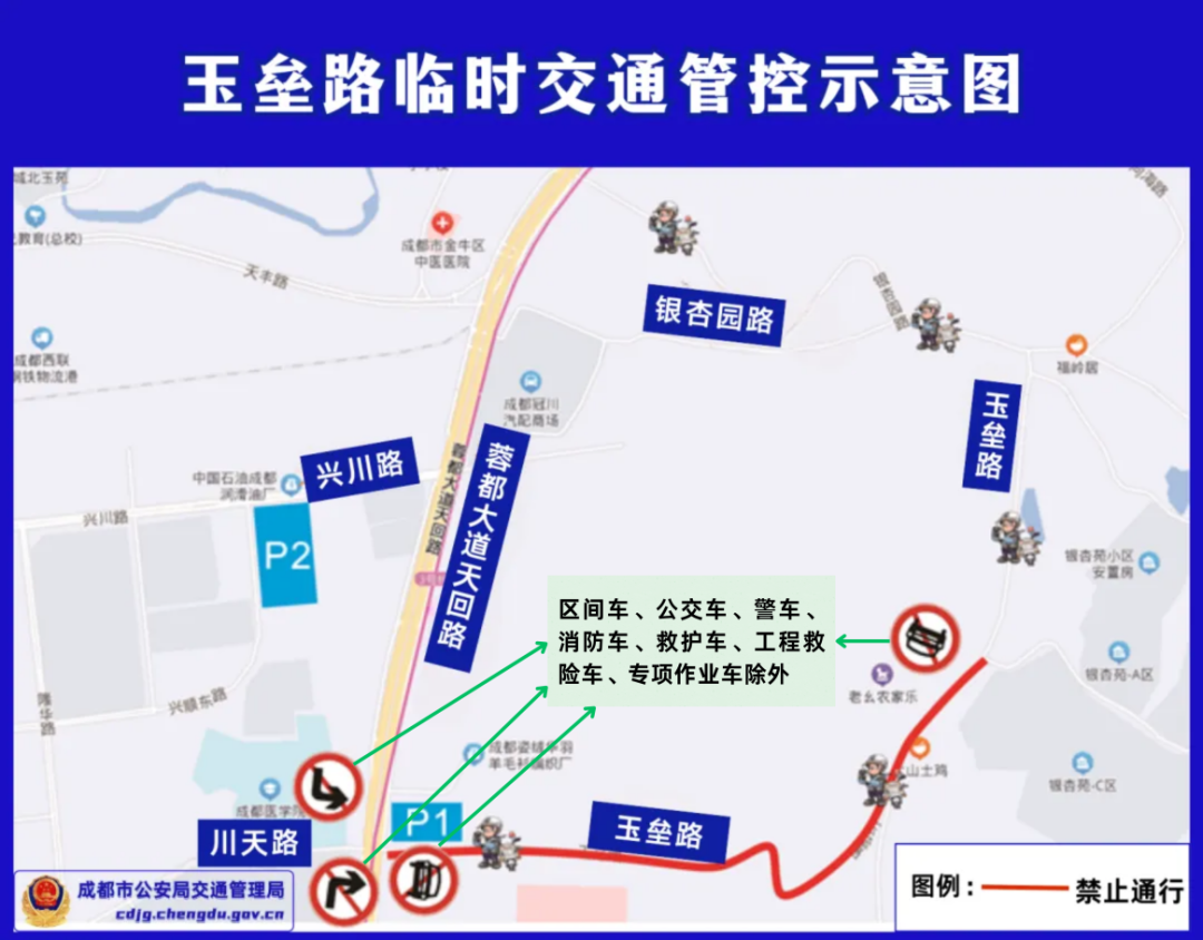 (二)玉垒路(蓉都大道天回路至翠微路段)禁止机动车通行(区间车、公交车、警车、消防车、救护车、工程救险车、专项作业车除外)。