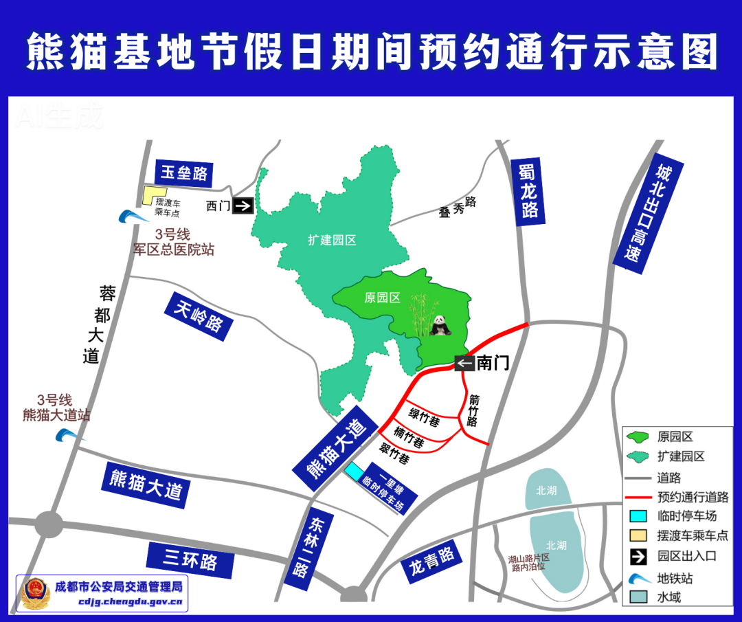 四川发布客户端消息 2月2日,记者从成都市公安局交通管理局获悉,为保障成都大熊猫繁育研究基地(以下简称“熊猫基地”)西门、南门周边道路大客流期间交通运行平稳有序,切实提升群众出行安全感、出游体验感,根据《中华人民共和国道路交通安全法》的规定,在 2026 年春节期间对熊猫基地周边道路实施机动车预约通行等管理措施。现将有关事项通告如下: