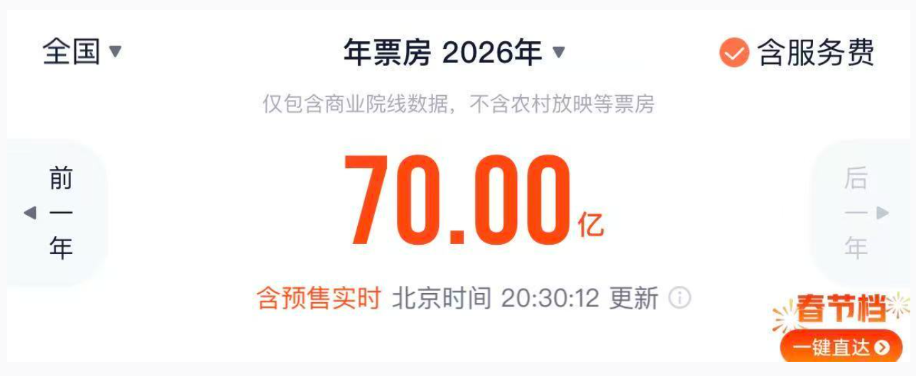 据网络平台数据,截至2月21日20时30分,2026年年度电影总票房(含预售)突破70亿!