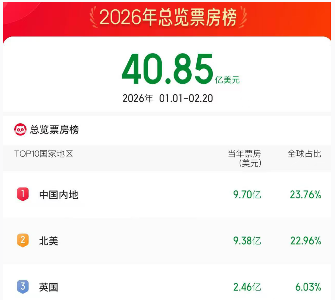 此外,据网络平台数据显示,2026年中国电影市场累计票房超9.70亿美元,超北美票房成绩,暂列全球单一市场票房冠军。