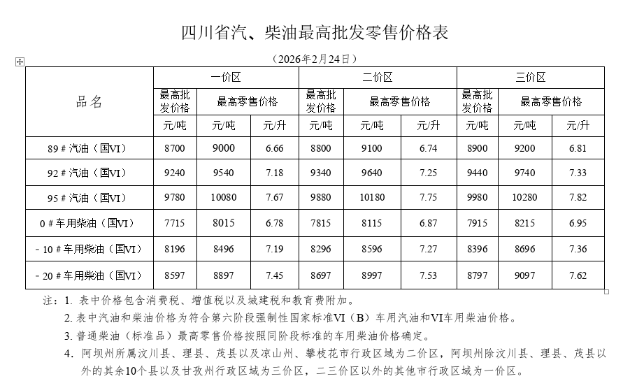 根据《通知》,国家发展改革委调整并公布了中心城市汽、柴油(标准品)最高零售价格,我省三个价区汽、柴油最高零售价格相应调整,调整后的价格自2026年2月24日24时起执行。