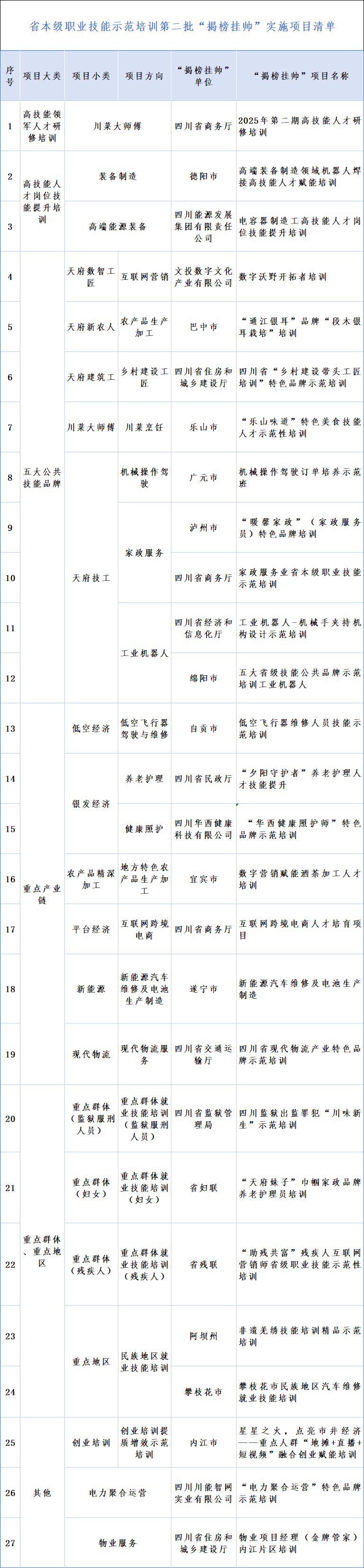 四川发布客户端消息 四川又一批“揭榜挂帅”项目来了!近日,四川省就业服务管理局公示《2025年第二批省本级职业技能示范培训“揭榜挂帅”实施项目清单》,共计涵盖高技能领军人才研修培训等6个大类21个小类,涉及互联网营销、川菜烹饪、家政服务、工业机器人等方向,公示期为2月26日—3月4日。