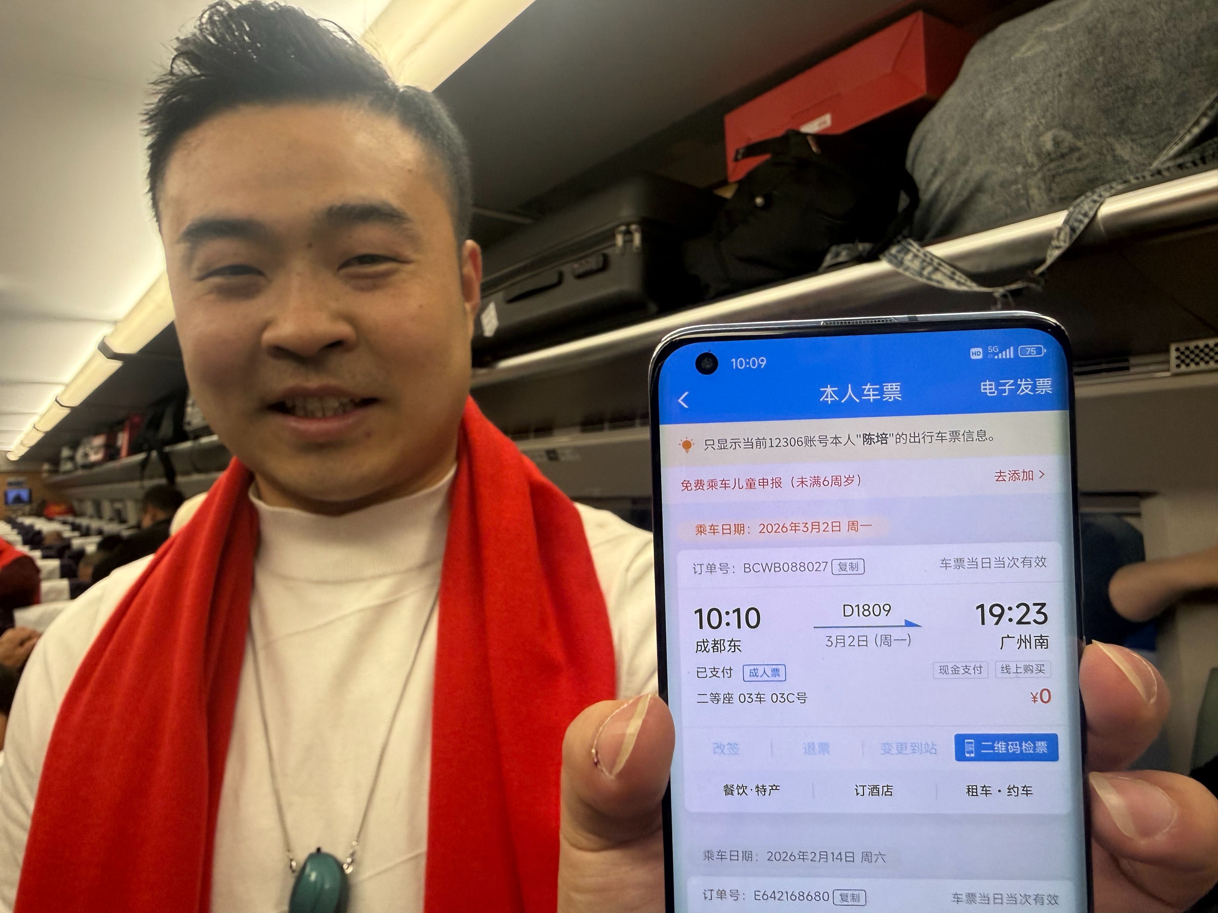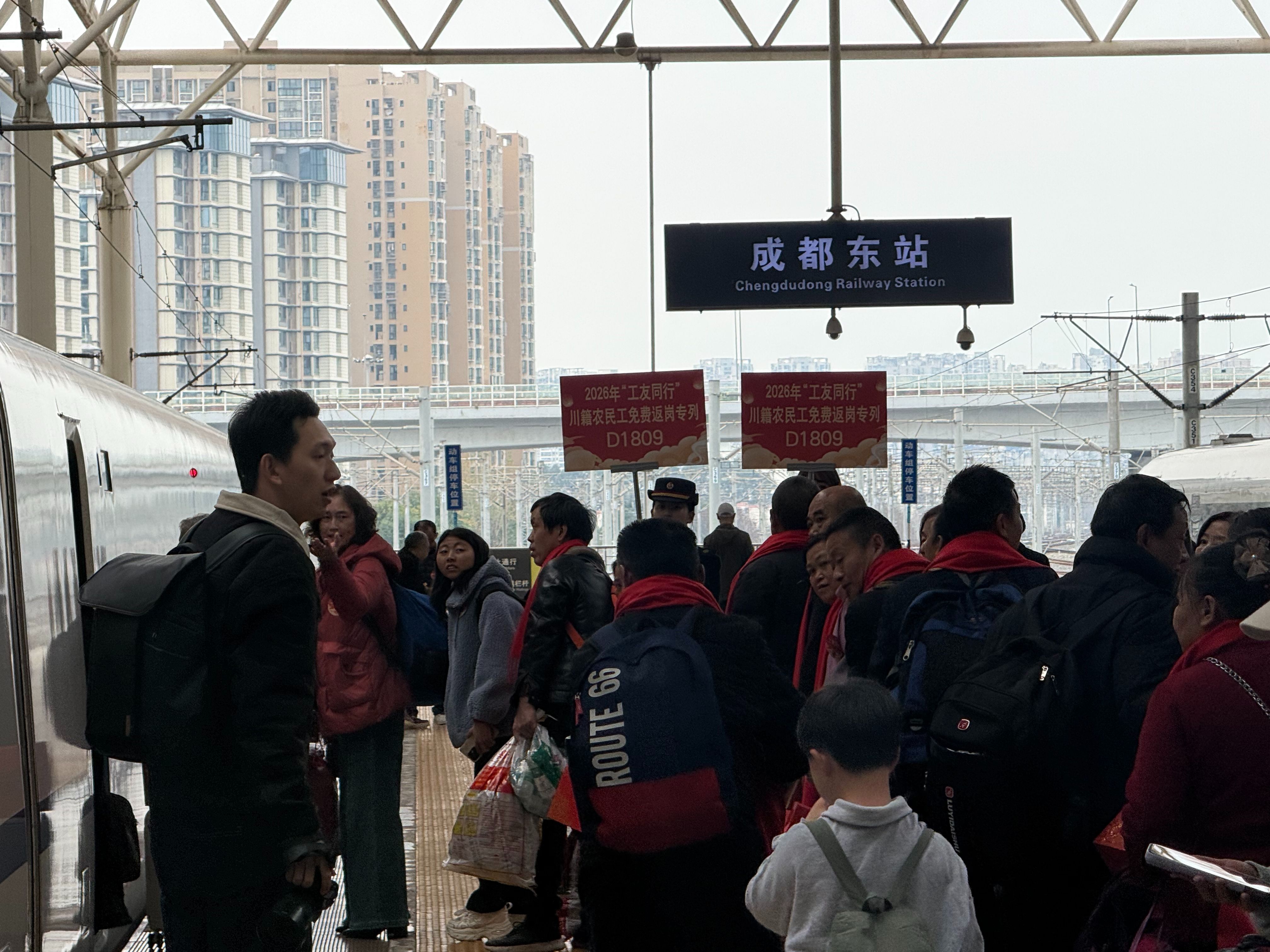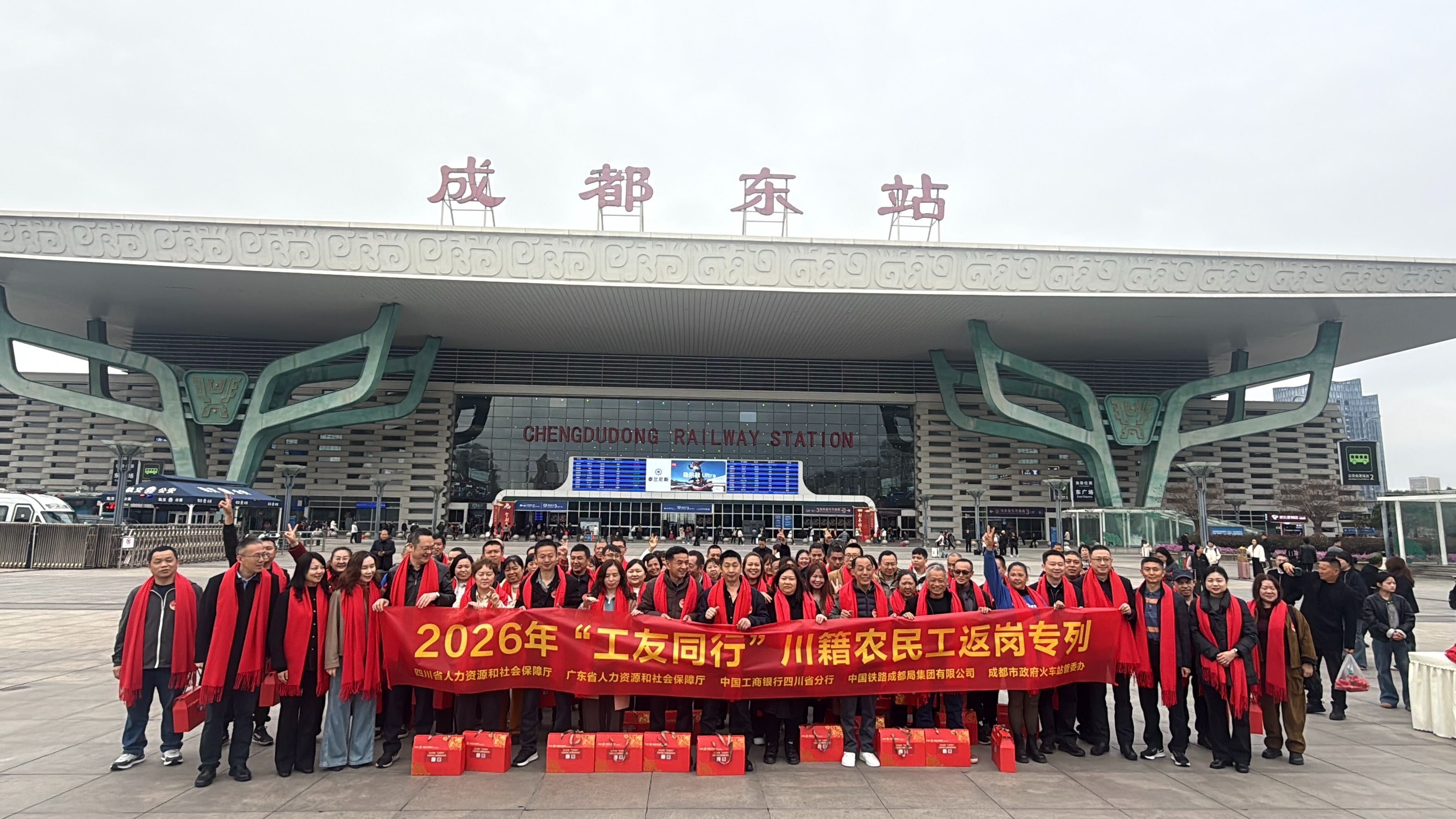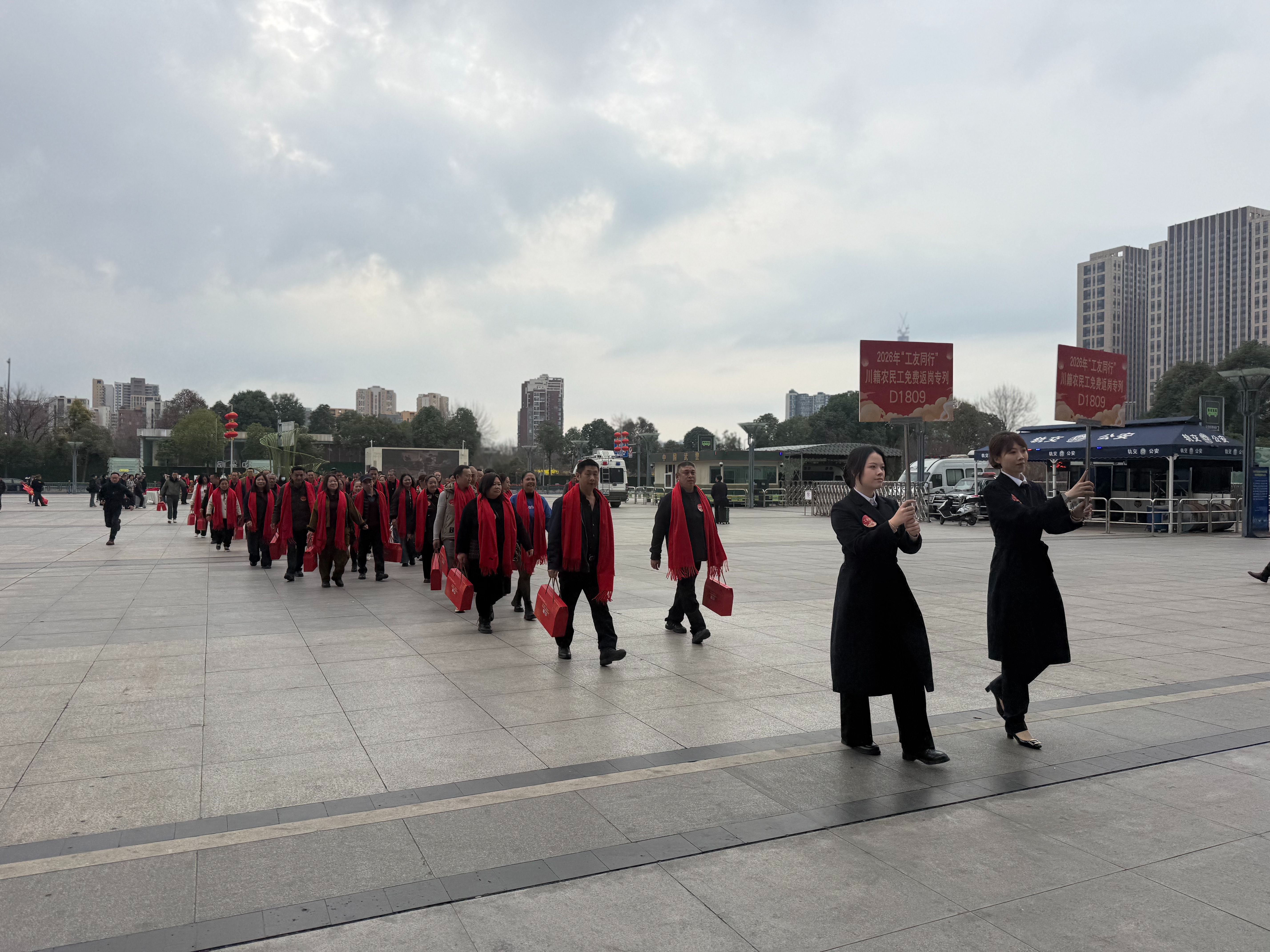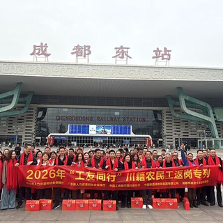 3月2日10:10,由四川省人力资源和社会保障厅、广东省人力资源和社会保障厅、中国工商银行四川省分行联合组织的2026年“工友同行”川籍农民工免费返岗专列D1809次列车顺利开行。760名川籍农民工分别从成都东站、眉山站、乐山站、宜宾西站出发,踏上前往广东返岗复工的温暖旅程。