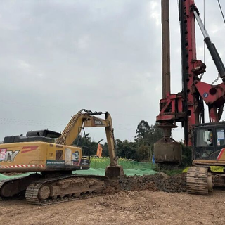 在G321泸县玉蟾至嘉明段改建工程项目九曲河段,宽敞的路基已经挖成。一台旋挖机、一台挖掘机正在河边配合作业:前者正在钻挖一根直径1.8米、深度20米的桩基孔,后者将钻孔挖出的泥土顺势拿来填埋路基。