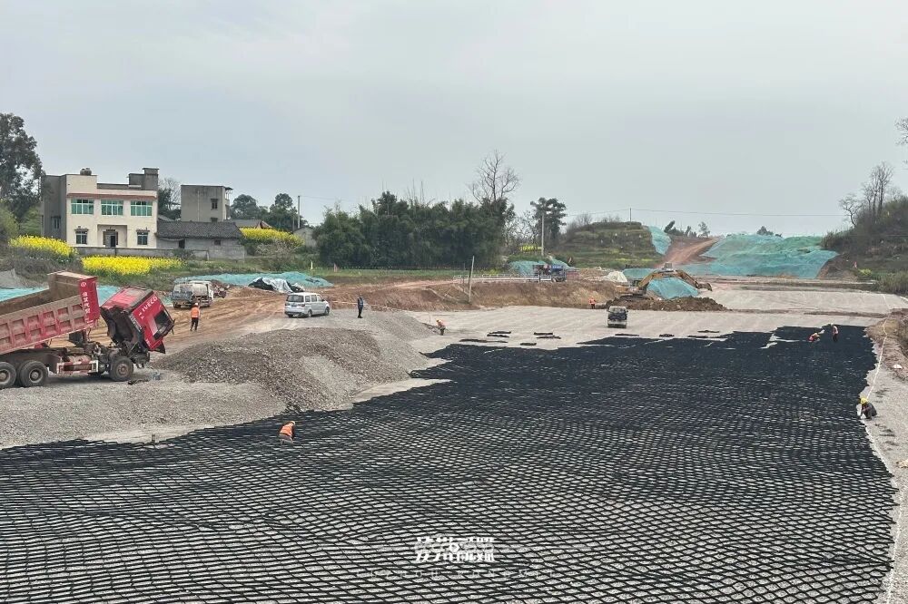 自永高速泸县段建设现场,工人正在安装黑色的土工格室。