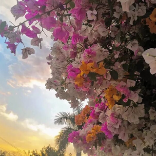 找到一处鲜花错落密集的地方,将身体融入其中,“闻花”“看花”,或者脸和三角梅轻贴在一起,只露出局部五官,“大片感”就出来啦。